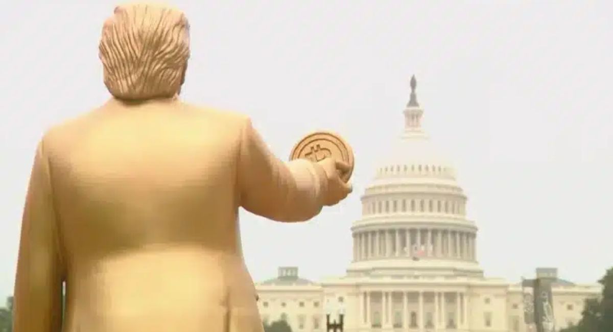 Estatua dorada de Trump con Bitcoin se instala frente al Capitolio