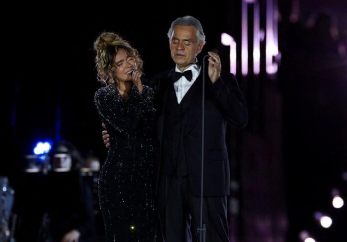 Durante su presentación, Karol G interpretó temas como “Mientras me curo del cora” con un atuendo de alta costura elegante y más tarde entonó “Vivo por ella” junto al tenor Bocelli, momento que emocionó al público presente.
