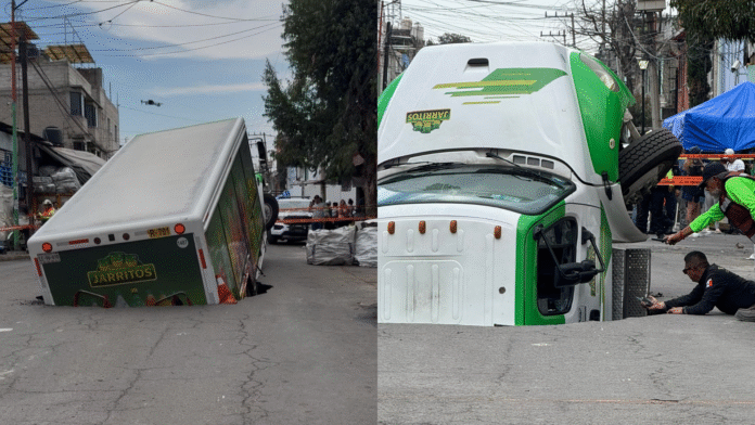 En fotografías compartidas en redes sociales se observa el enorme agujero que se abrió en el pavimento y que terminó por “tragarse” un camión de la empresa Jarritos, entre Av. 5 y Calle 4 de la colonia Renovación.