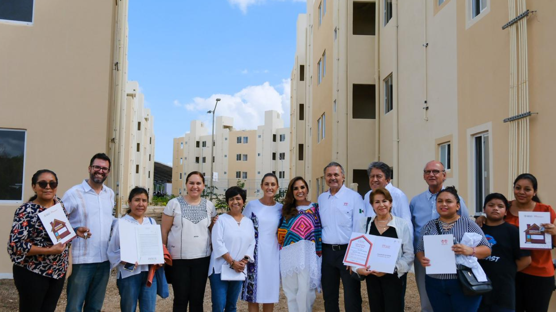 La presidenta Claudia Sheinbaum Pardo encabezó la entrega de 225 viviendas nuevas del Instituto del Fondo Nacional de la Vivienda para los Trabajadores (Infonavit) en Playa del Carmen, Quintana Roo, como parte del programa Vivienda para el Bienestar, además de 497 liberaciones de hipoteca del Fondo de Vivienda del Instituto de Seguridad y Servicios Sociales (Fovissste) y 193 escrituras del Instituto Nacional del Suelo Sustentable (INSUS).