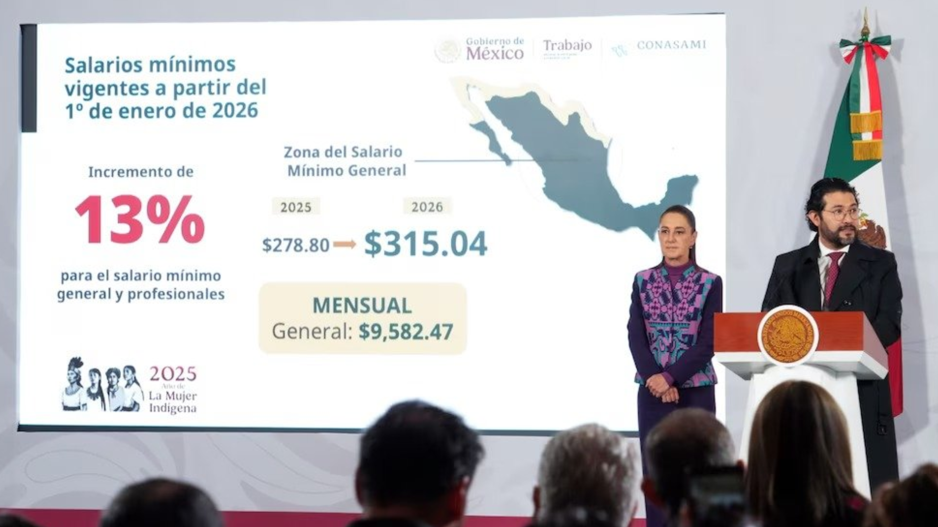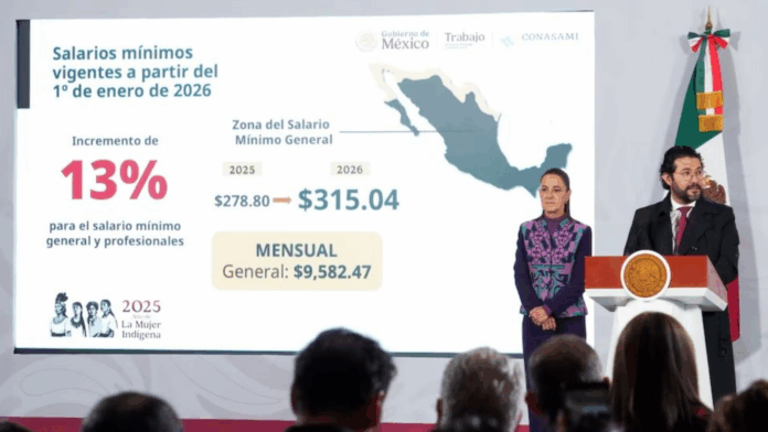 La presidenta Claudia Sheinbaum anunció que el salario mínimo general tendrá un aumento del 13 por ciento en 2026, lo que lo elevará a 9 mil 582.47 pesos mensuales. Durante su conferencia matutina, destacó que este incremento fue acordado por consenso entre empresarios y trabajadores, y subrayó que no generará presiones inflacionarias ni aumentos en los precios de los productos básicos.