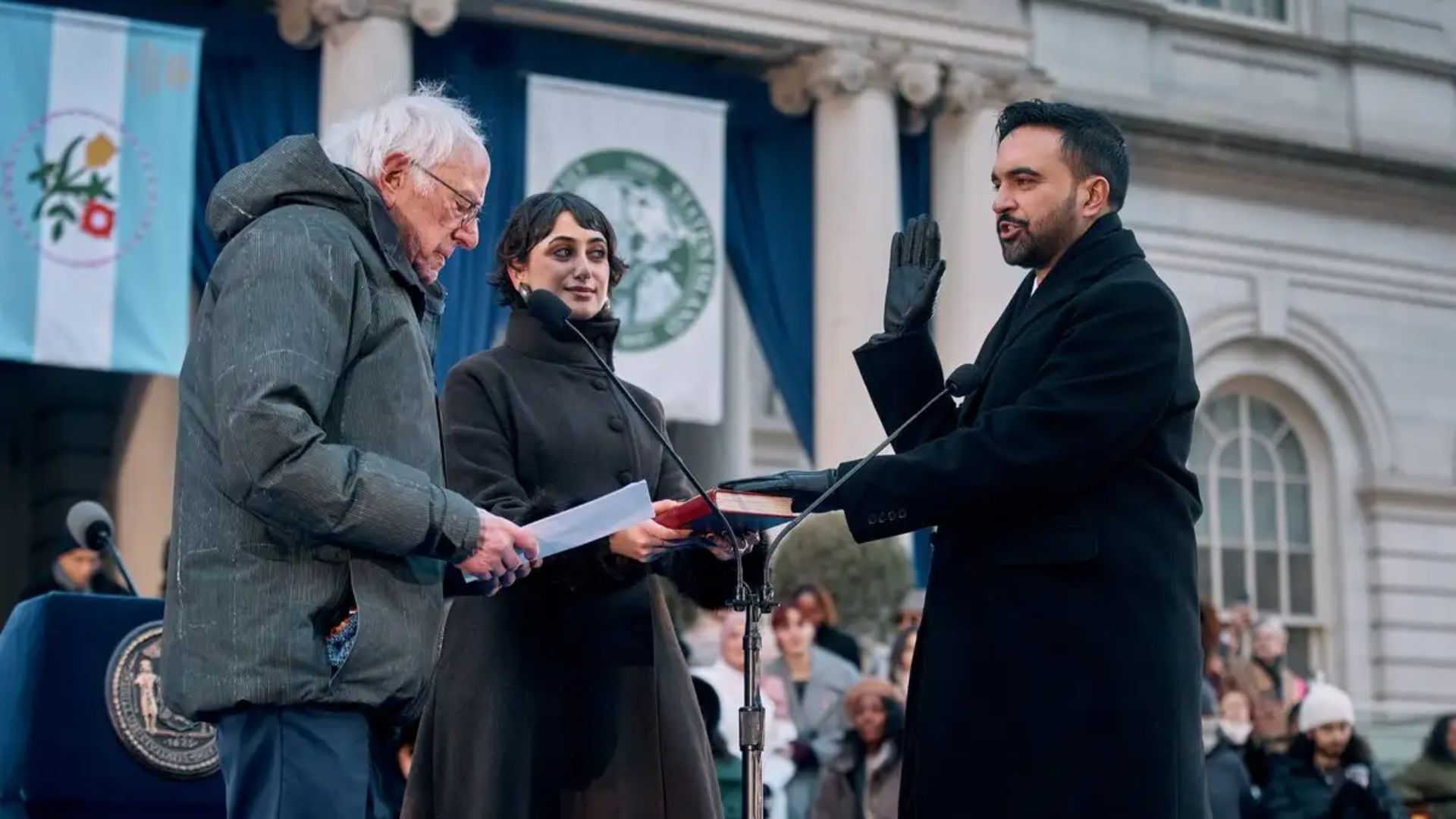 Durante el acto participaron figuras del ala progresista del Partido Demócrata, entre ellas el senador Bernie Sanders, quien estuvo a cargo del juramento simbólico, y la congresista Alexandria Ocasio-Cortez, quien dirigió un mensaje a los asistentes. También se llevaron a cabo intervenciones religiosas de distintos credos, en respaldo a la diversidad cultural y social de la ciudad.